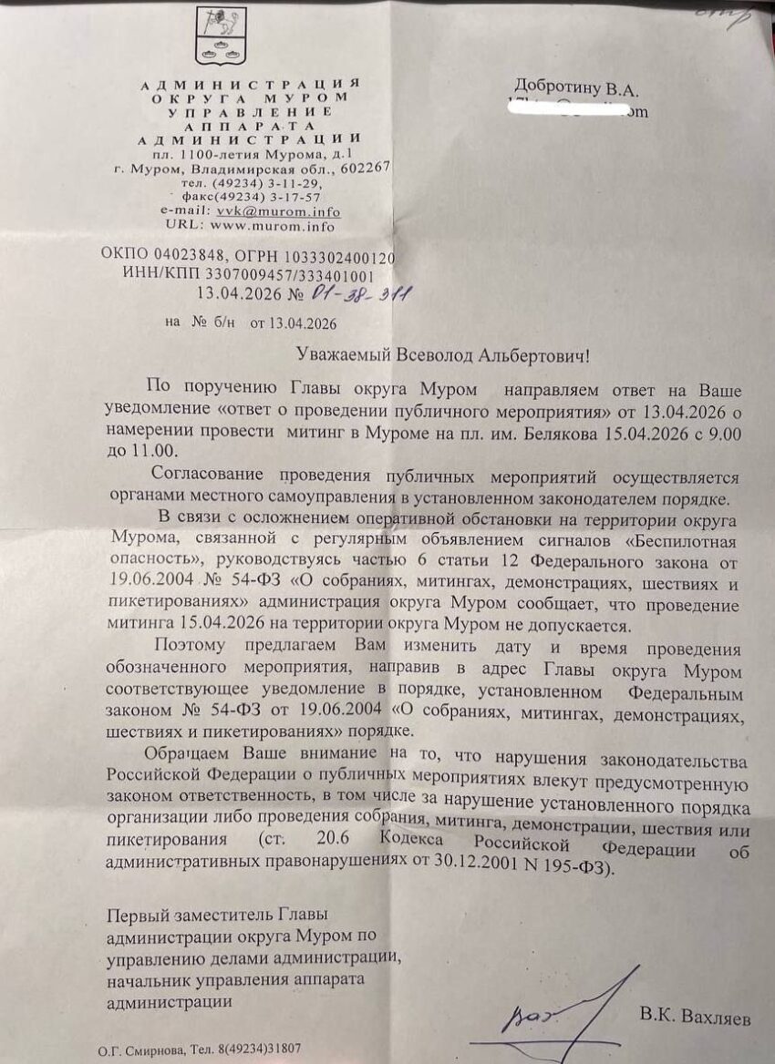 Городская администрация Мурома опять сослалась на беспилотную опасность во время войны с Украиной, запрещая проведение митинга против блокировок интернета.